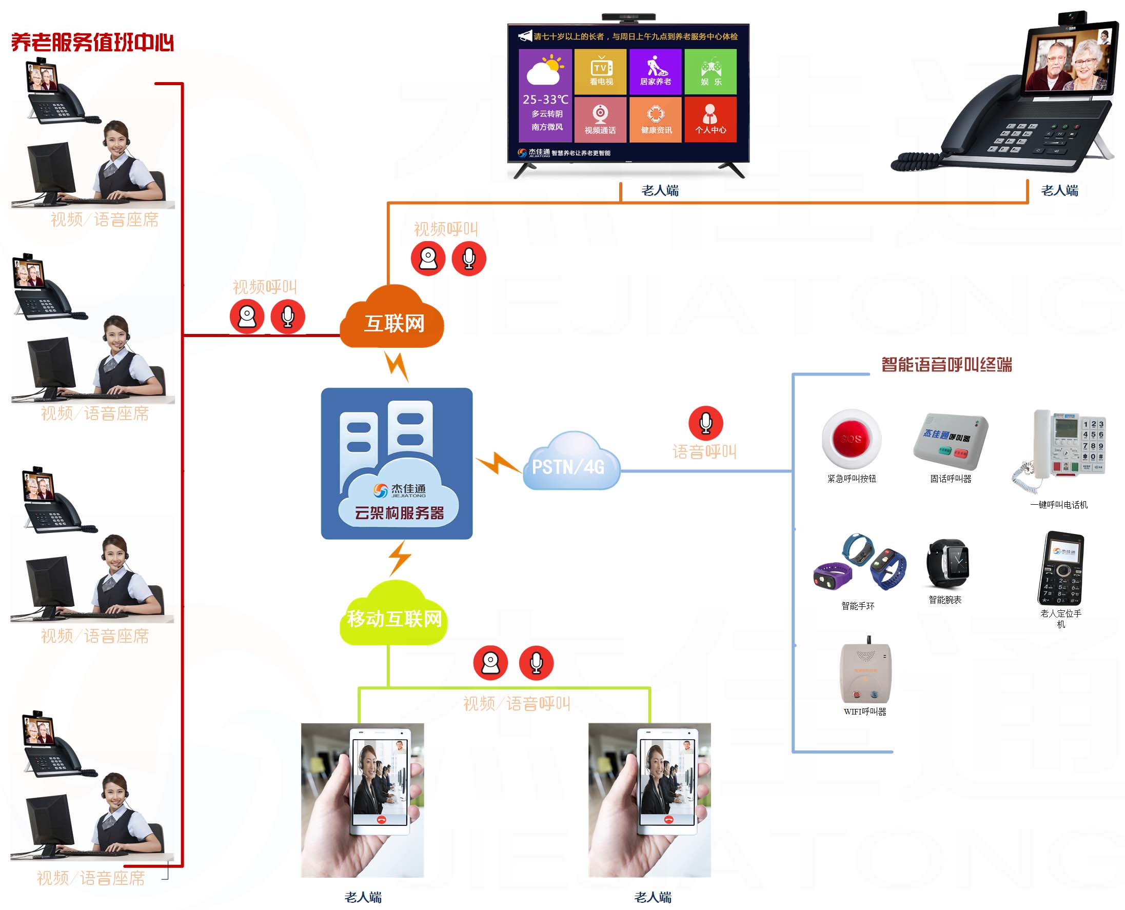 杰佳通自主研發(fā)的智慧養(yǎng)老平臺(tái)中把可視化功能完美應(yīng)用于老人需求提交,看得見的養(yǎng)老服務(wù)--視頻應(yīng)用在智慧養(yǎng)老平臺(tái)中得到充分體現(xiàn),老人可以通過“智能手機(jī)”、“電視”、“平板電腦”進(jìn)行可視化(視頻)呼叫服務(wù)中心或者服務(wù)商和子女。