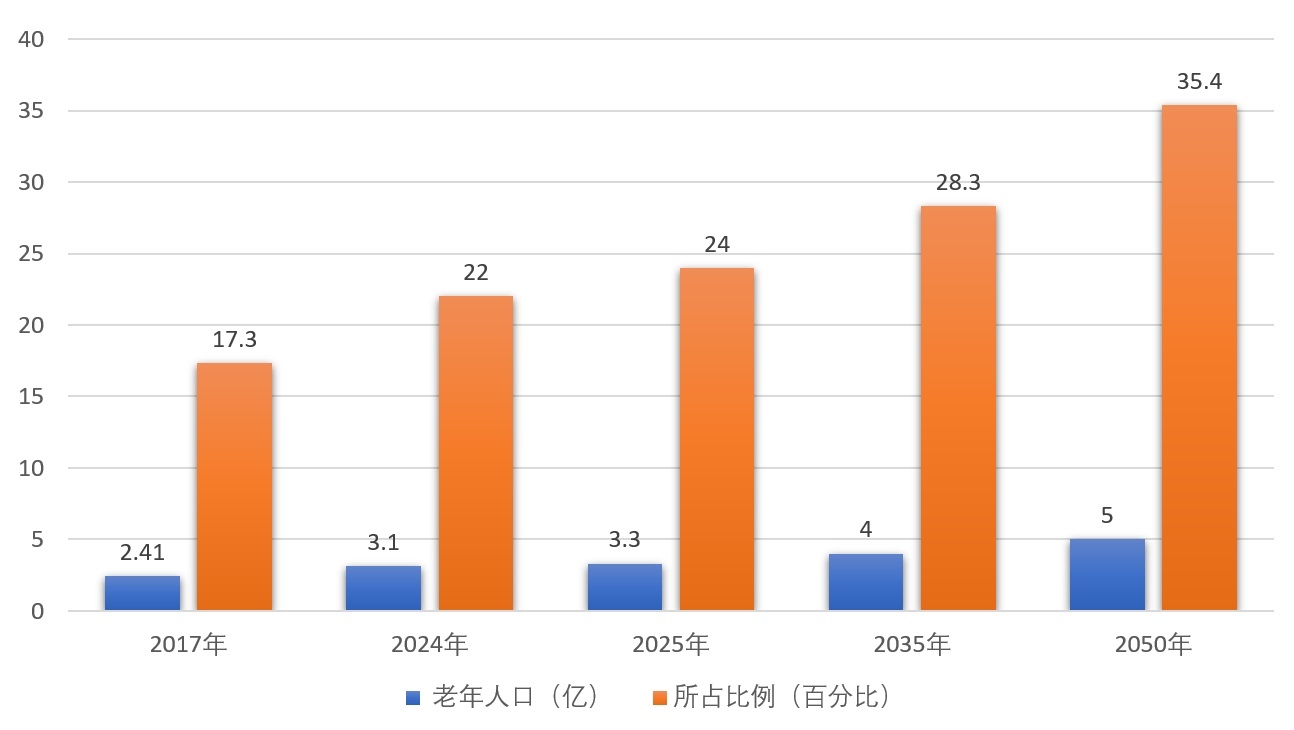 我國確立了“以居家為基礎、社區為依托、機構為支撐”的養老產業框架和養老格局,90%居家養老,7%在社區養老,3%在機構中養老;2025年1月17日,國家統計局發布,截至2024年底,我國60歲及以上老年人口有3.1億人,占總人口22%,其中,65歲及以上人口超2.2億人,占15.6%。2035年左右我國60歲及以上老年人口將突破4億,在2050年前后達到頂峰,約占總人口的1/3。那時,中國將有4.8億、甚至接近5億老年人,是世界上老年人口最多的國家。