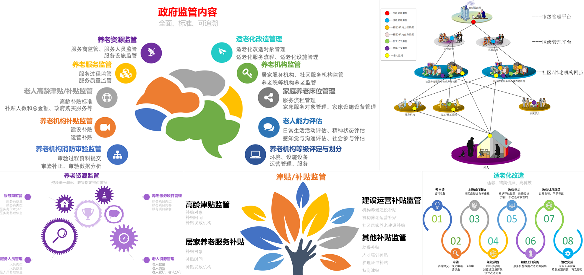 解決養老服務的監管難題,在充分調研參考全國各地政府監管需求以及先進經驗的基礎上,投入五百萬元研發出適合智慧政府管理的綜合養老監管平臺,通過搭建智慧養老服務監管平臺并實現常態化的運營,實現了養老服務的實時過程監管,通過信息化手段提高民政對養老機構的監管水平,同時實現部門間的信息共享和業務協同。